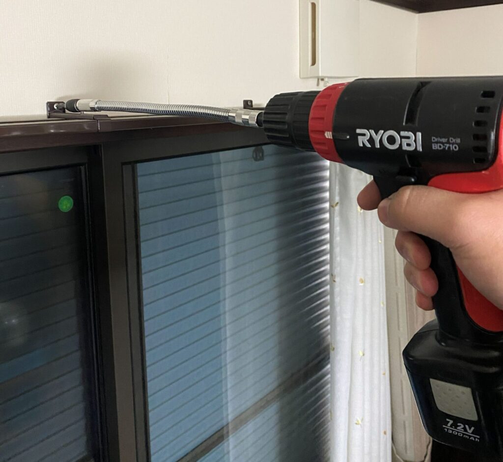 フレキシブルシャフトを使用すると、この様に電動ドリルドライバーが入る位置から操作することで、ビスを締める事が出来ます。