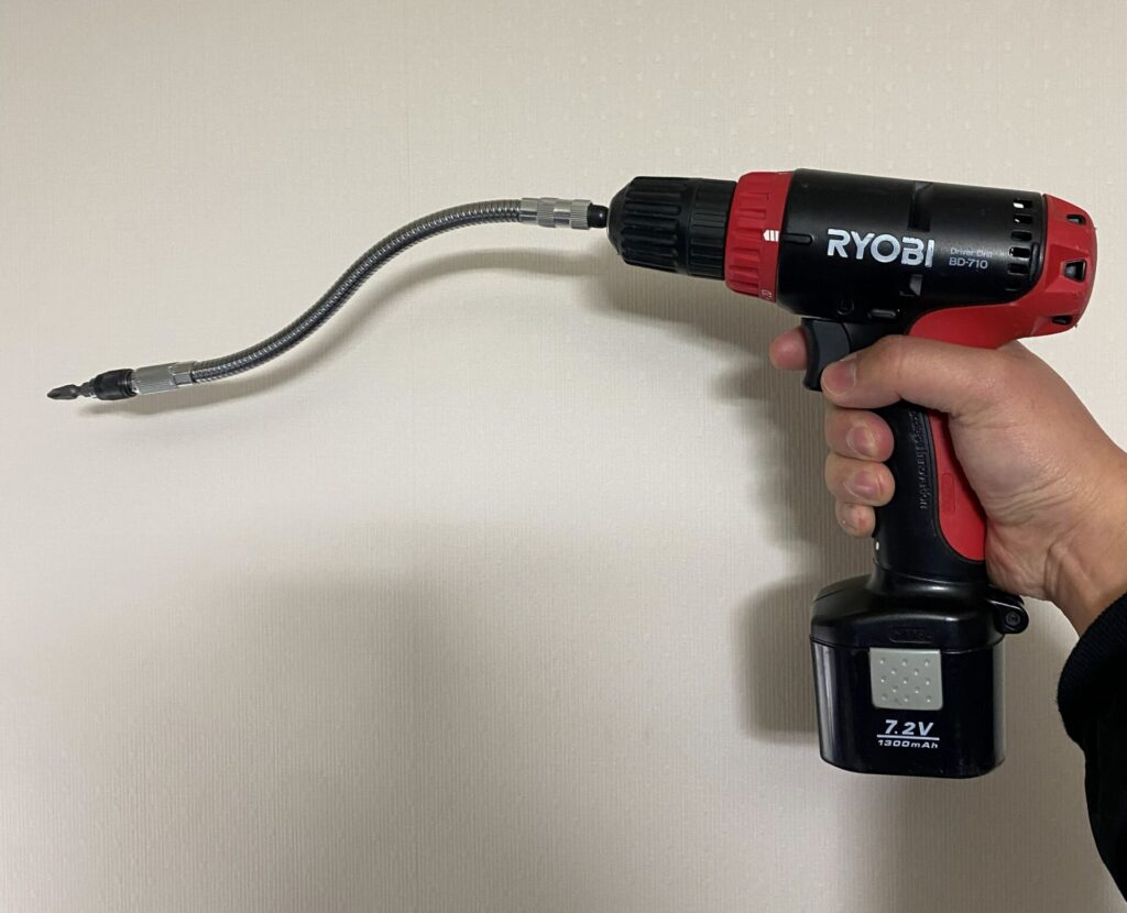 電動ドリルドライバー本体が入らないような狭い空間にあるビスでも、フレキシブルシャフトには長さがあり曲げることも可能なので、少し離れた位置から本体を操作することでビスを締めることができる様になります。