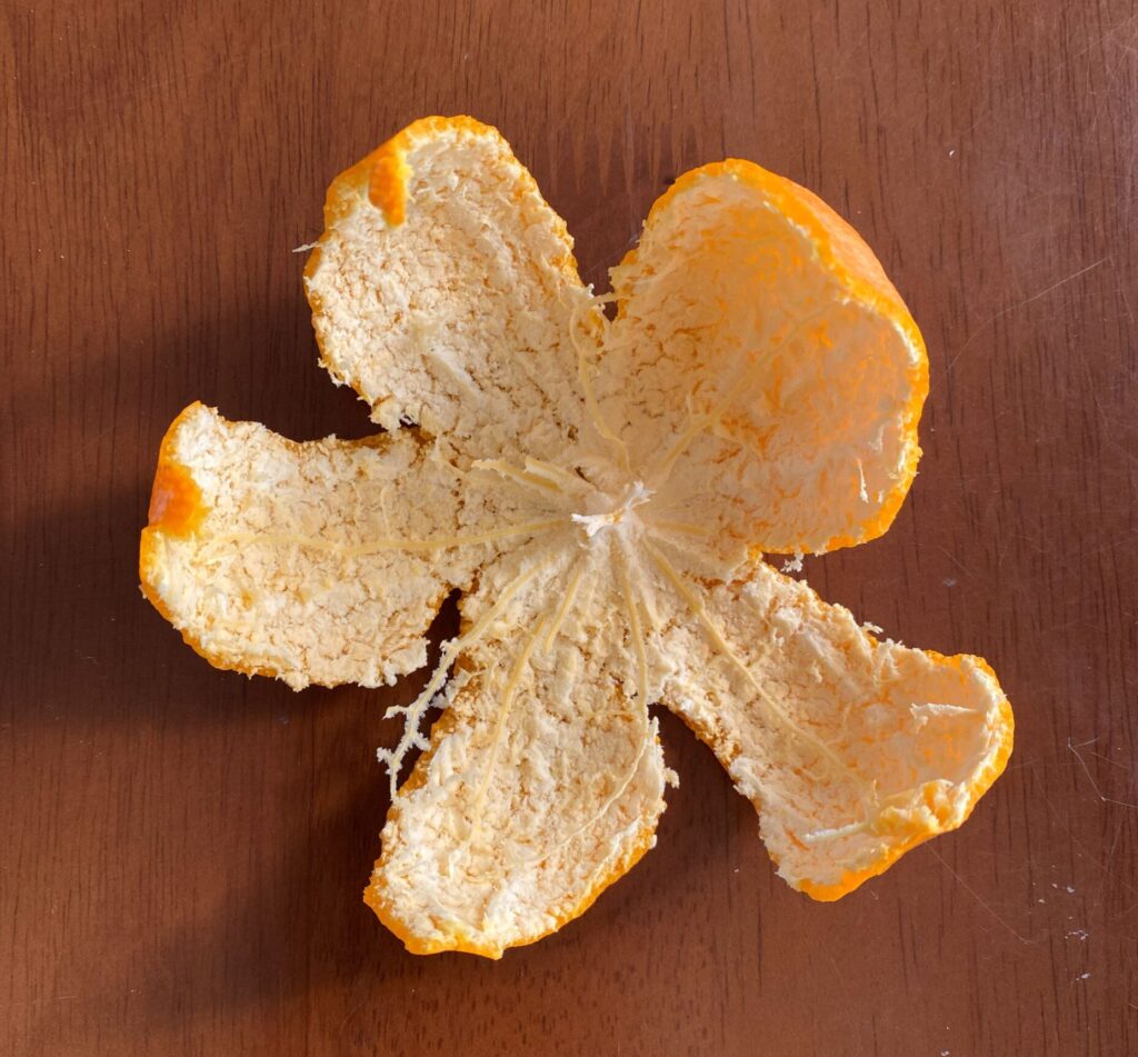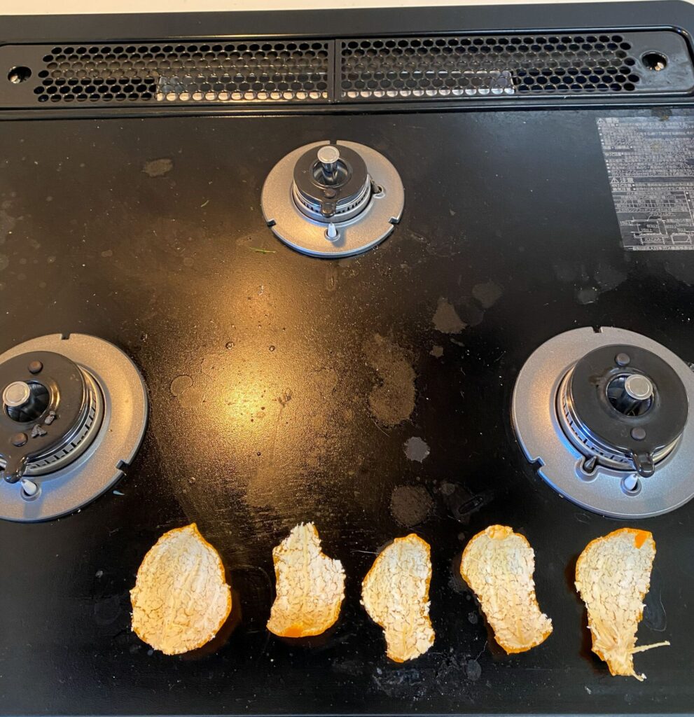 ハウスクリーニング中に小腹が空いた時、おやつ代わりにみかんを食べます。そしてその皮はガスコンロを掃除するまで捨てずに残しておきます。
