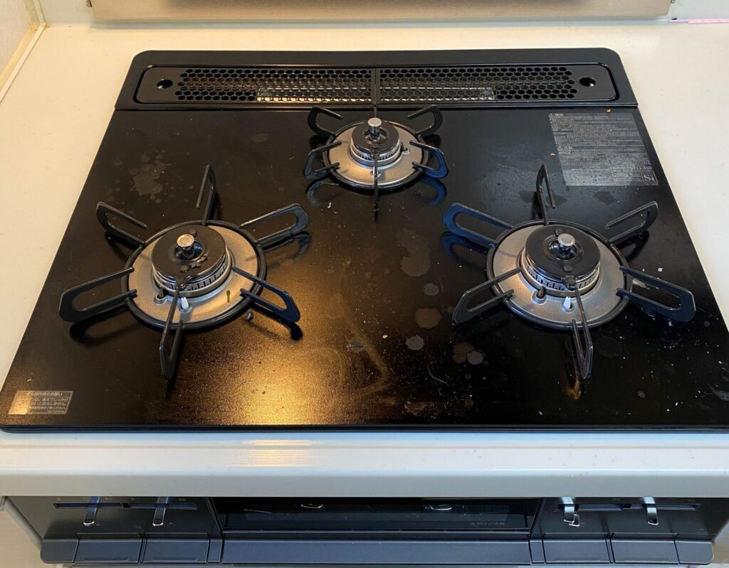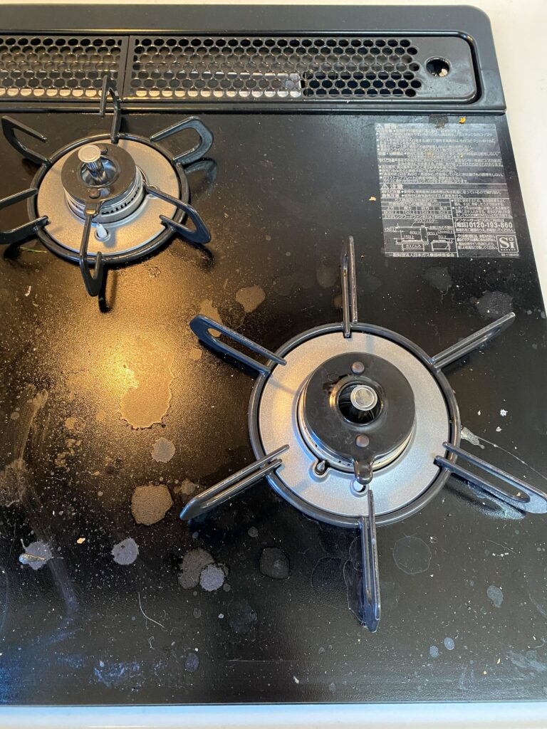 今回はこちらのガスコンロを掃除していきます。(※閲覧注意 汚れの映像がアップで映りますので、お食事中の方はご注意下さい)