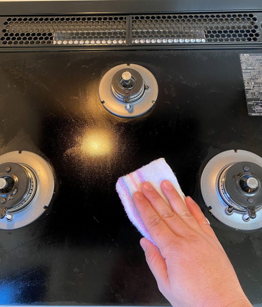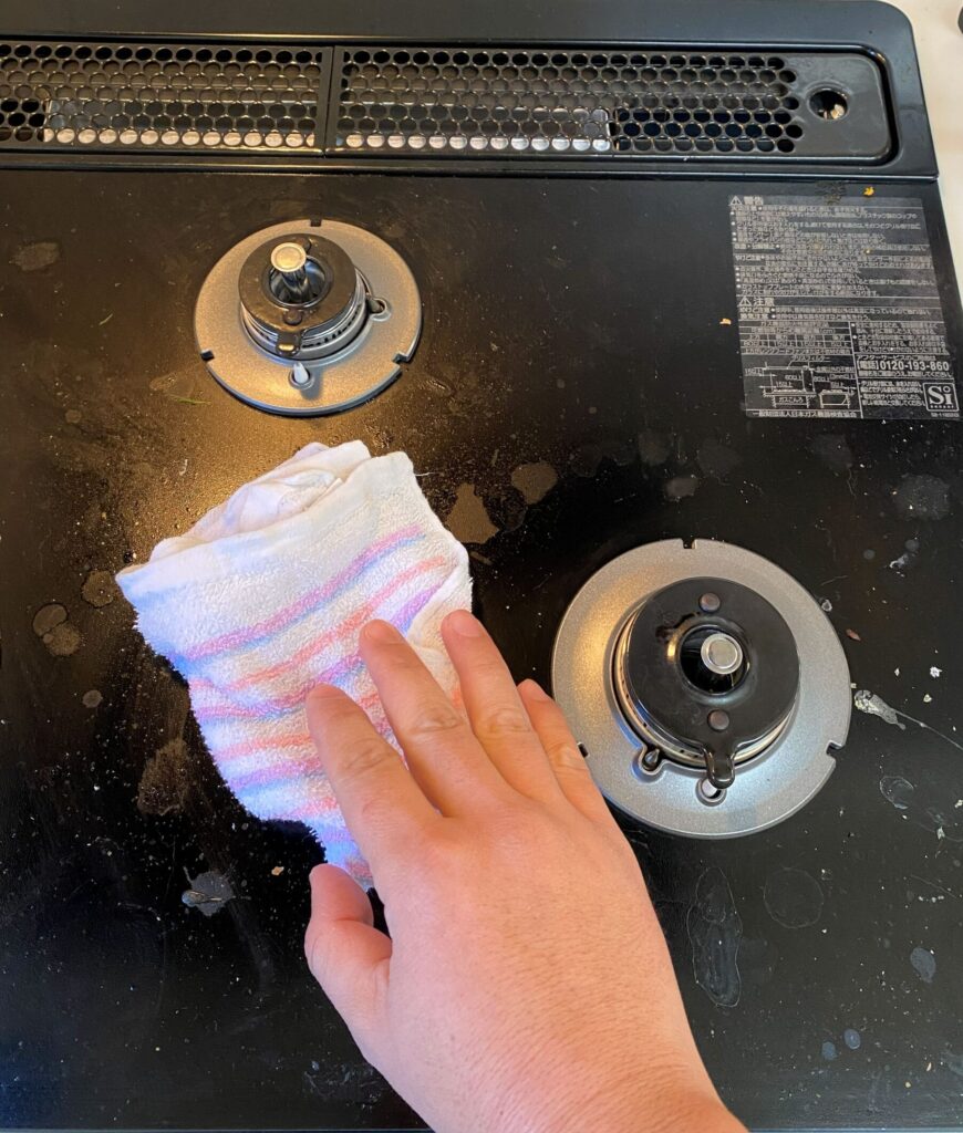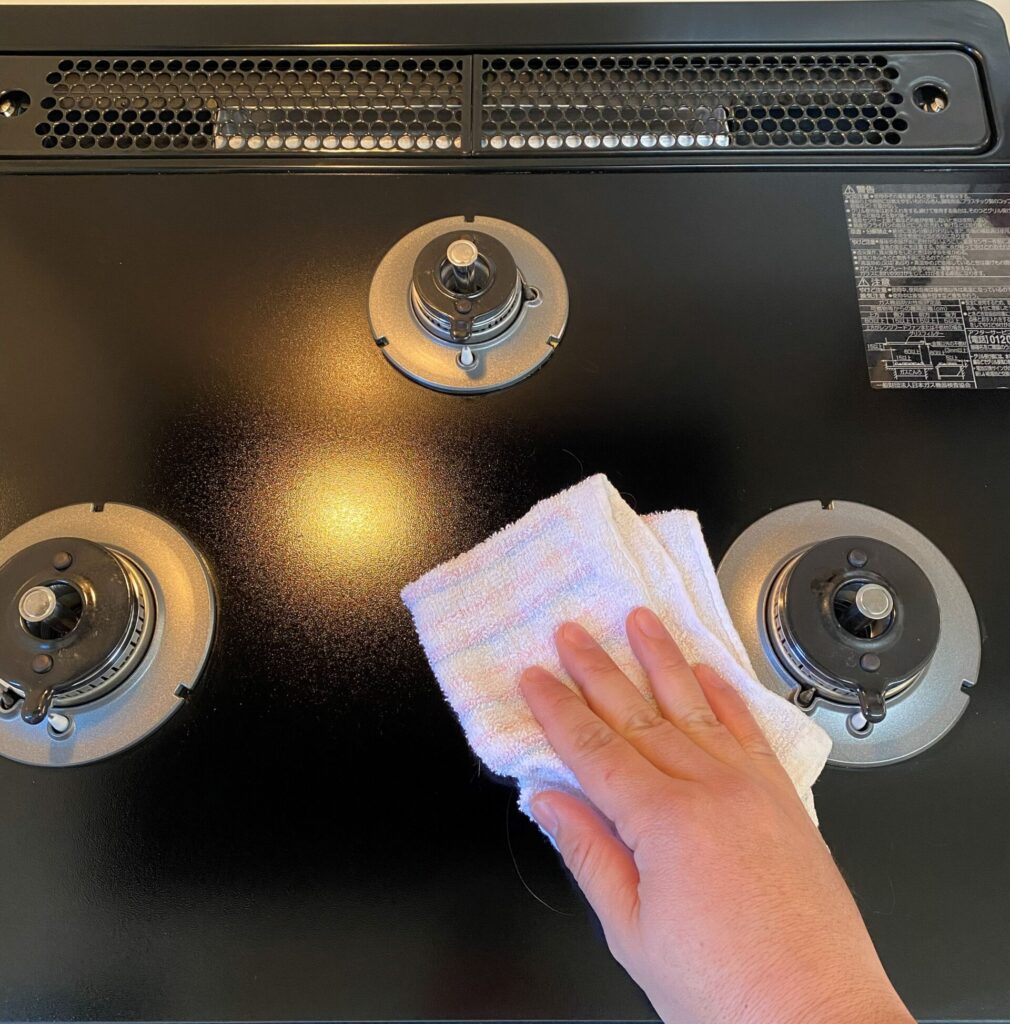ガスコンロの油汚れ落としに着手する前に、まずはコンロ表面に付着しているコゲなどのゴミを、布巾などで軽く拭き取っておきます。