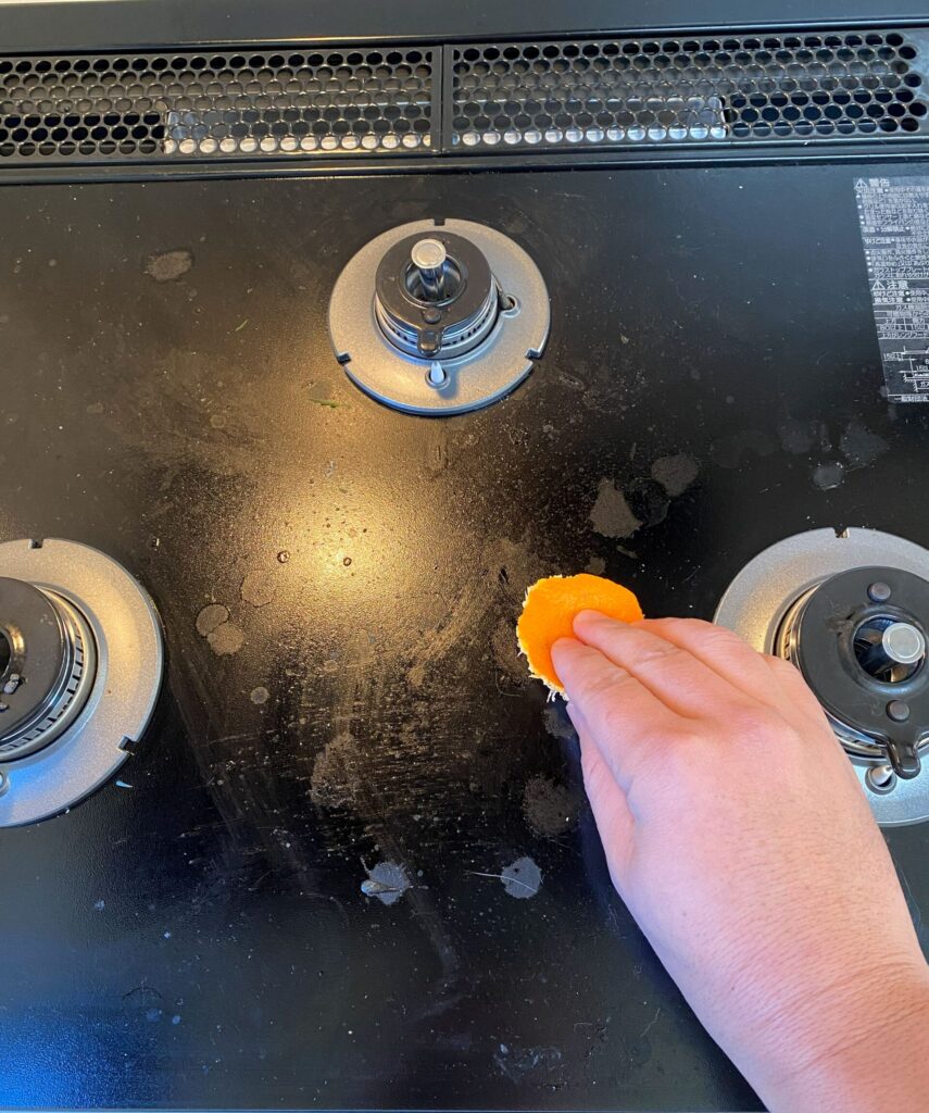 コンロの表面全体を切り分けたみかんの皮3枚を使い掃除していきます。